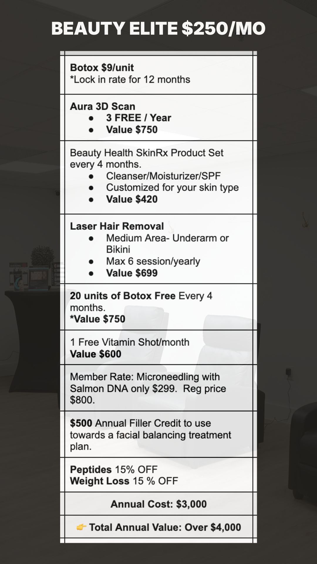 👉 Many members save $800–$1,000+ per year on Botox and peptides alone — before counting free laser hair removal, skincare sets, vitamin shots, and filler credits.
